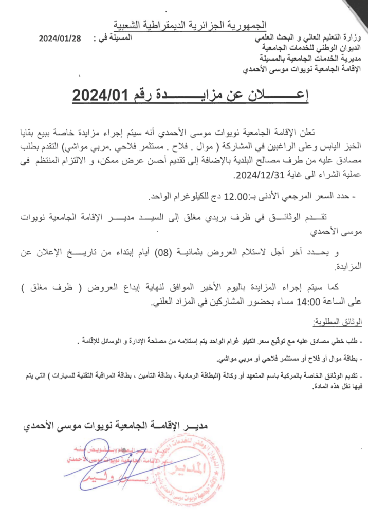 إعلان عن مزايدة 2024/01 خاصة ببيع بقايا الخبز اليابس/ الإقامة الجامعية نويوات موسى الأحمدي