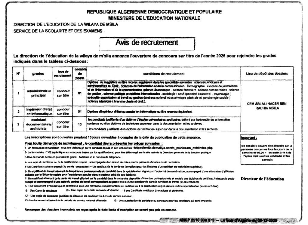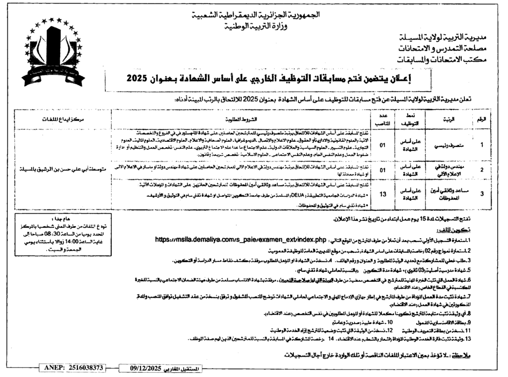 إعلان عن مسابقات التوظيف الخارجي على أساس الشهادة 2025/ مديرية التربية الوطنية لولاية المسيلة