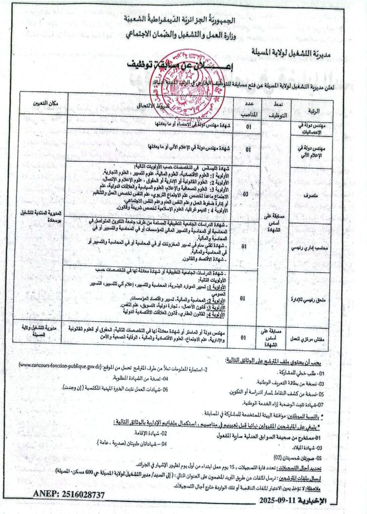 إعلان عن مسابقة توظيف الخارجي/ مديرية التشغيل لولاية المسيلة
