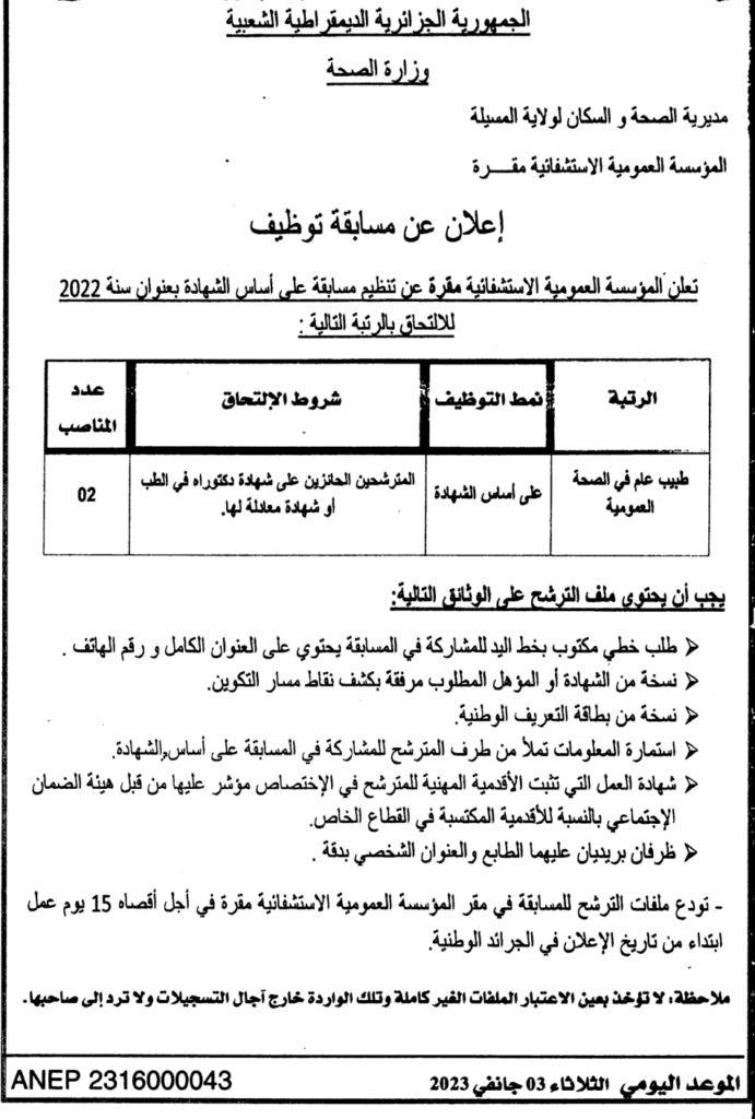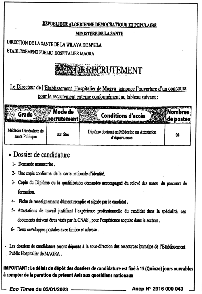 إعلان عن مسابقة توظيف/ المؤسسة العمومية الاستشفائية مقرة