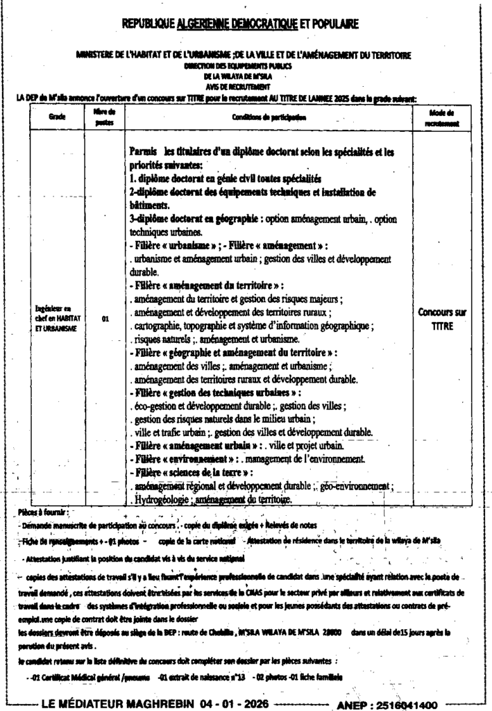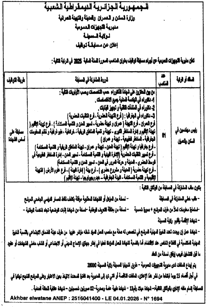 إعلان عن مسابقة توظيف رئيس المهندسيين في السكن والعمران/ مديرية التجهيزات العمومية لولاية المسيلة