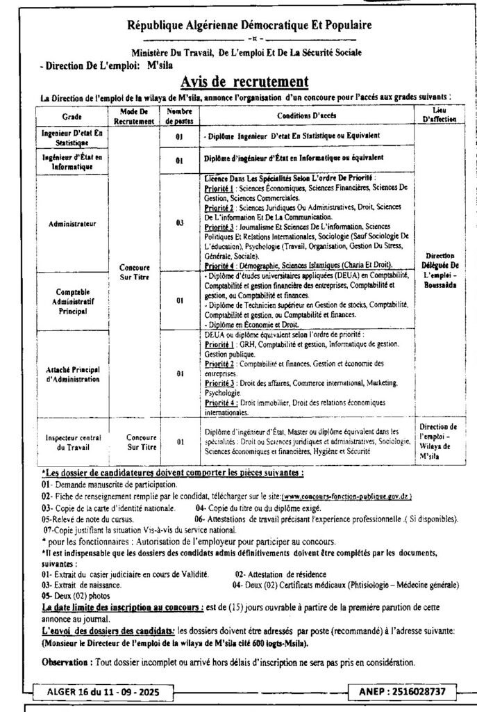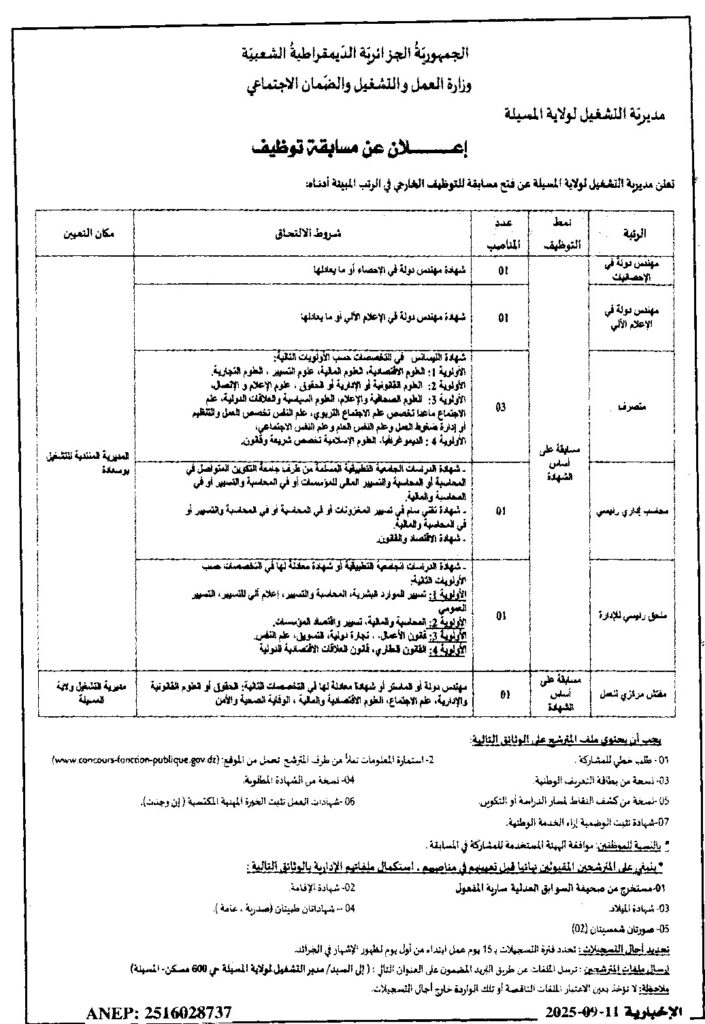 إعلان عن مسابقة توظيف على أساس الشهادة/ مديرية التشغيل لولاية المسيلة