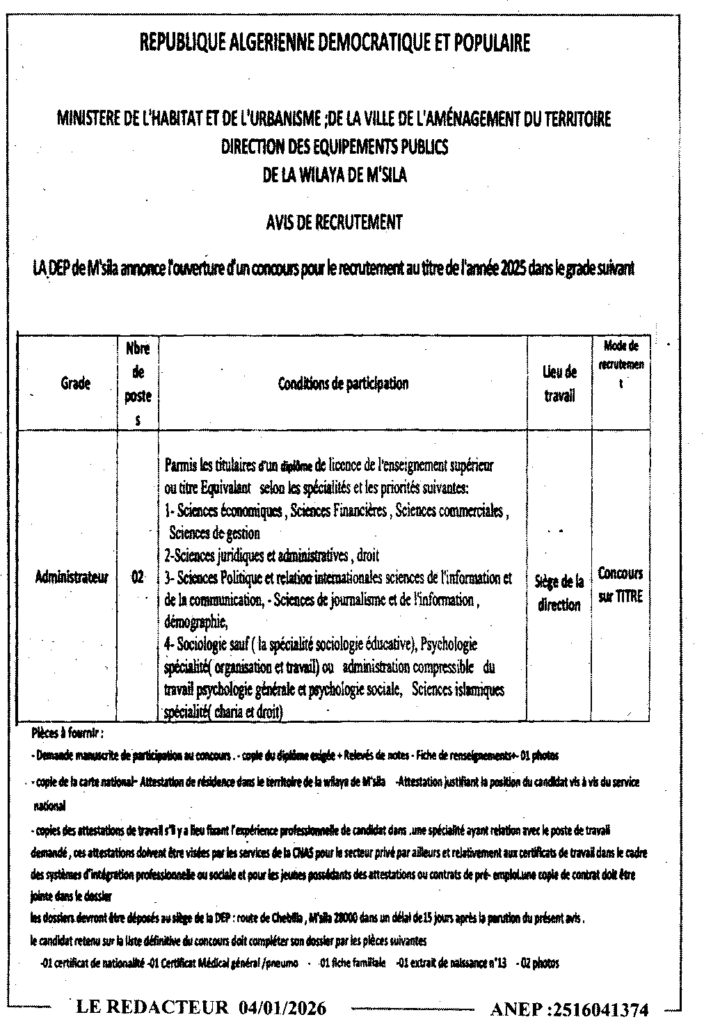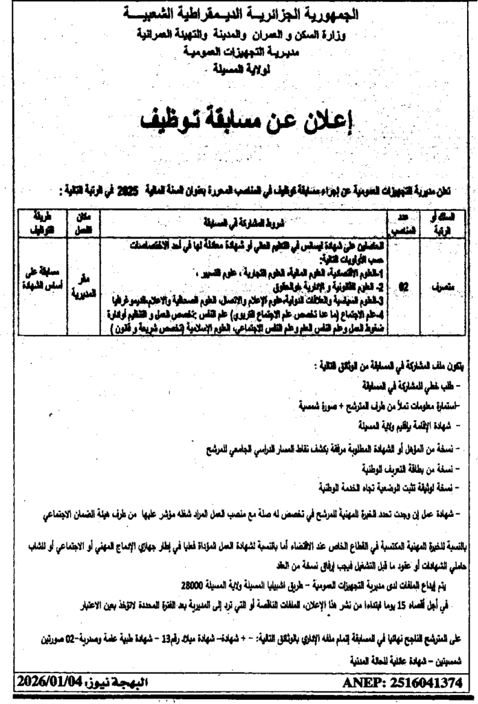 إعلان عن مسابقة توظيف متصرف/ مديرية التجهيزات العمومية لولاية المسيلة