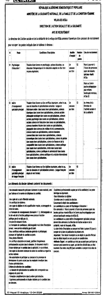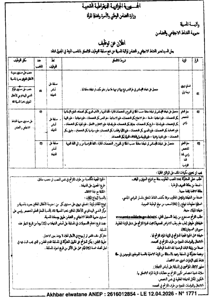 إعلان عن مسابقة للتوظيف/ مديرية النشاط الاجتماعي والتضامن لولاية المسيلة