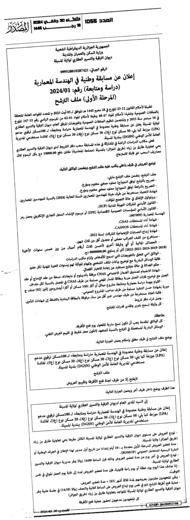 إعلان عن مسابقة وطنية في الهندسة المعمارية (دراسة ومتابعة) 2024/01 المرحلة الأولى ملف الترشح/ ديوان الترقية والتسيير العقاري لولاية المسيلة
