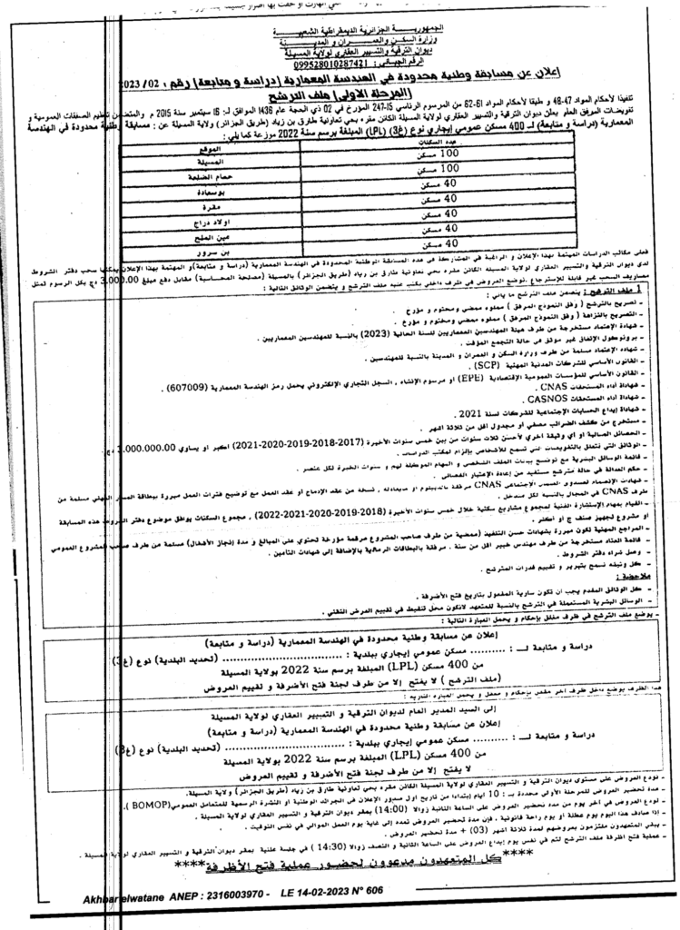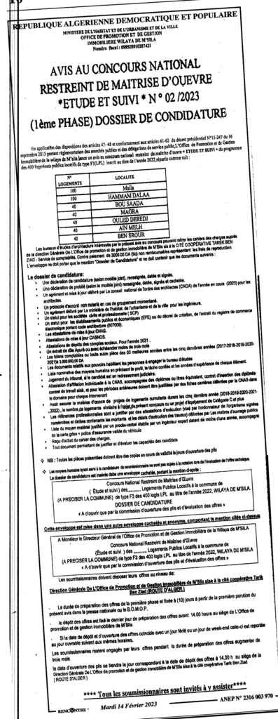 إعلان عن مسابقة وطنية محدودة في الهندسة المعمارية (دراسة ومتابعة) 2023/02 (المرحلة الأولى) ملف الترشح ديوان الترقية والتسيير العقاري لولاية المسيلة