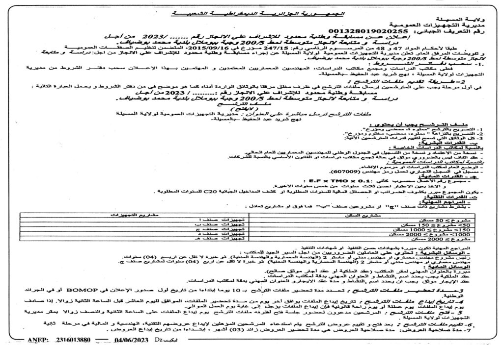 إعلان عن مسابقة وطنية محدودة للإشراف على الإنجاز من أجل دراسة ومتابعة لانجاز متوسطة نمط 200/5 وجبة ببوملال بلدية محمد بوضياف/ مديرية التجهيزات العمومية لولاية المسيلة
