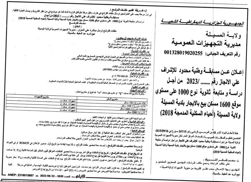 إعلان عن مسابقة وطنية محدودة للإشراف على الانجاز من أجل دراسة ومتابعة ثانوية نوع 1000 على مستوى موقع 1600 مسكن بيع بالايجار بلدية المسيلة (أحياء السكنية المدمجة 2018)