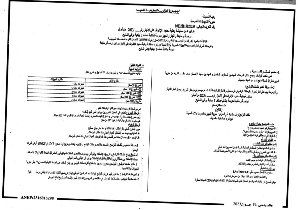 إعلان عن مسابقة وطنية محدودة للإشراف على الانجاز من أجل دراسة ومتابعة وانجاز وتجهيز مدرسة ابتدائية صنف 1 ببلدية بوطي السايح/ مديرية التجهيزات العمومية لولاية المسيلة