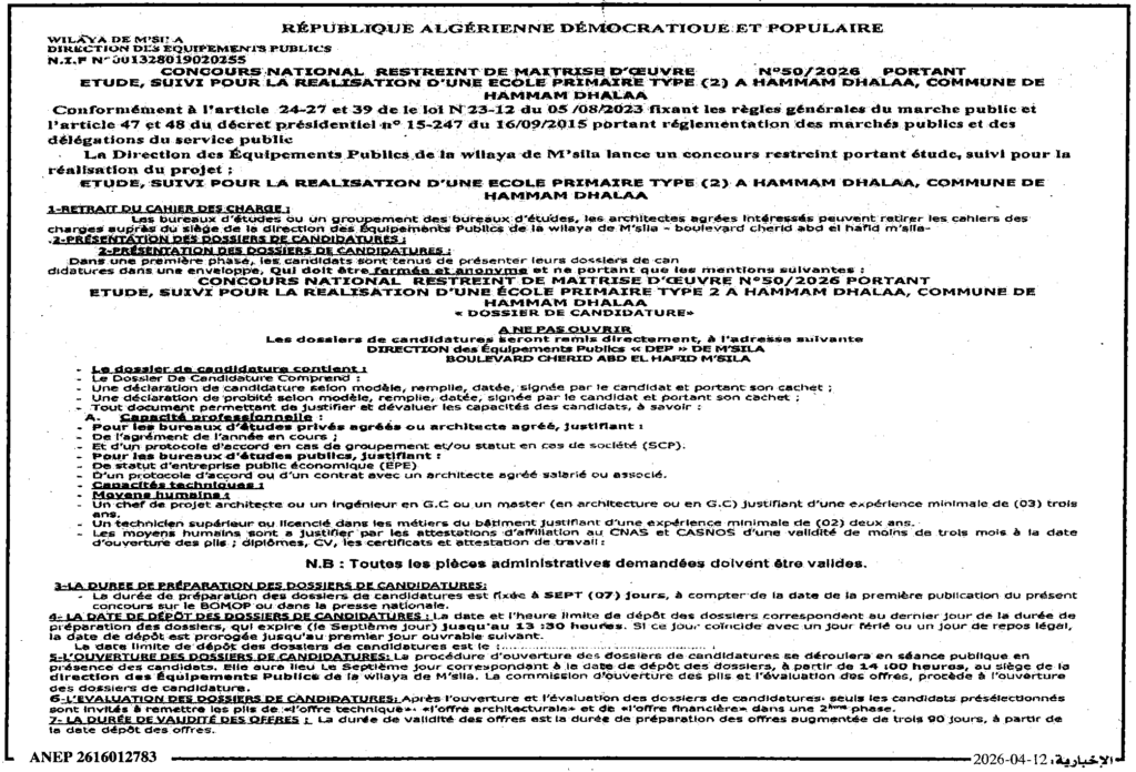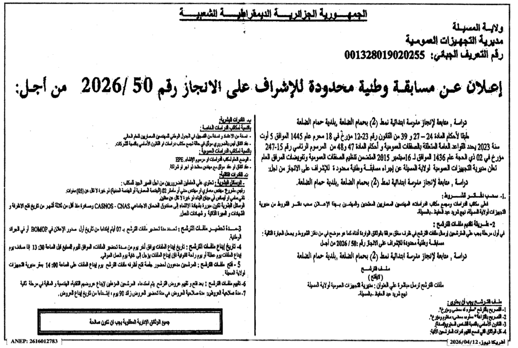 إعلان عن مسابقة وطنية محدودة للإشراف على الإنجاز 2026/50 مديرية التجهيزات لولاية المسيلة