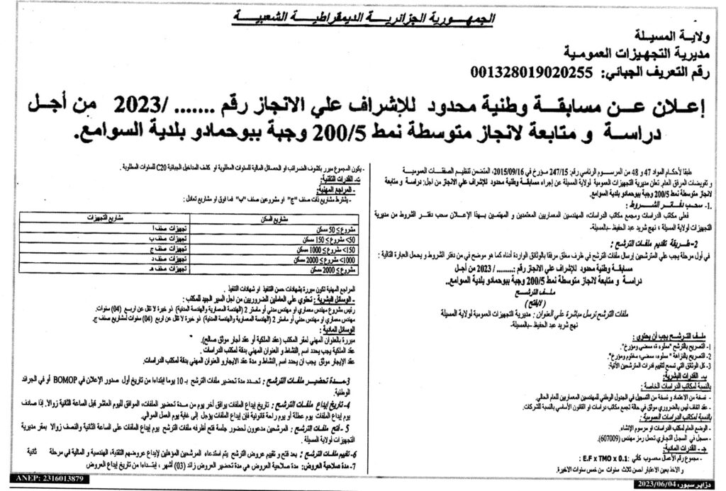 إعلان عن مسابقة وطنية محدودة للإشراف على الإنجاز من أجل دراسة ومتابعة لانجاز متوسطة نمط 200/5 وجبة ببوحمادو بلدية السوامع/ مديرية التجهيزات العمومية لولاية المسيلة