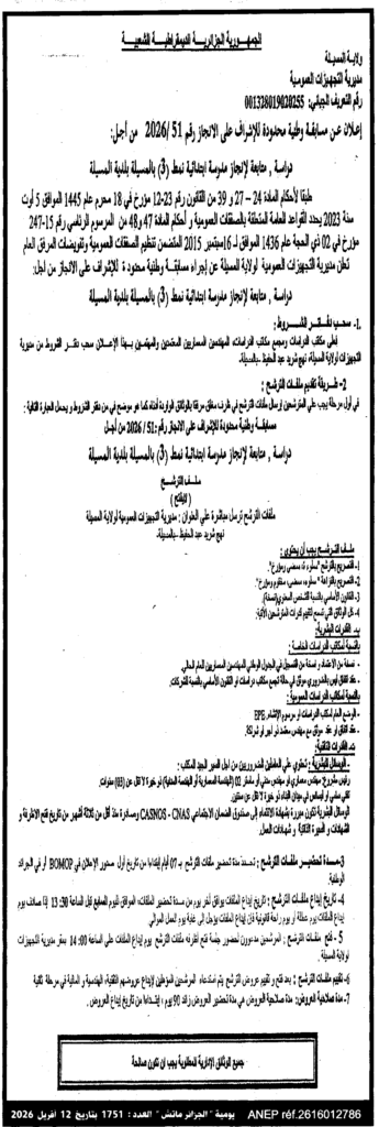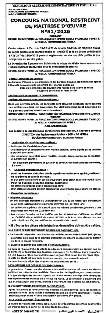 إعلان عن مسابقة وطنية محدودة للإشراف على الإنجاز 2026/51 مديرية التجهيزات لولاية المسيلة