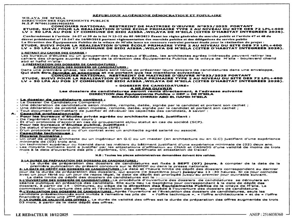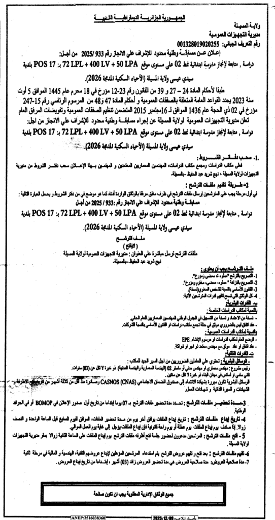 إعلان عن مسابقة وطنية محدودة للاشراف على الانجاز 2025/933 مديرية التجهيزات العمومية لولاية المسيلة