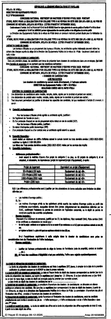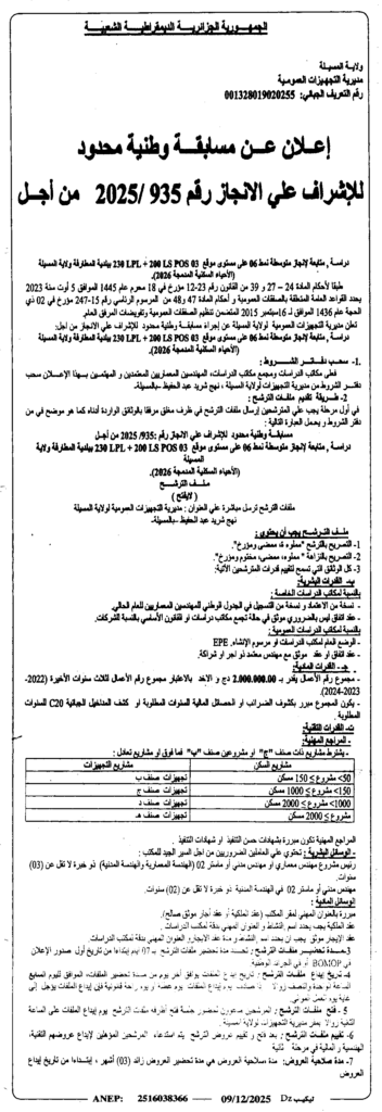 إعلان عن مسابقة وطنية محدودة للاشراف على الانجاز 2025/935 مديرية التجهيزات العمومية لولاية المسيلة