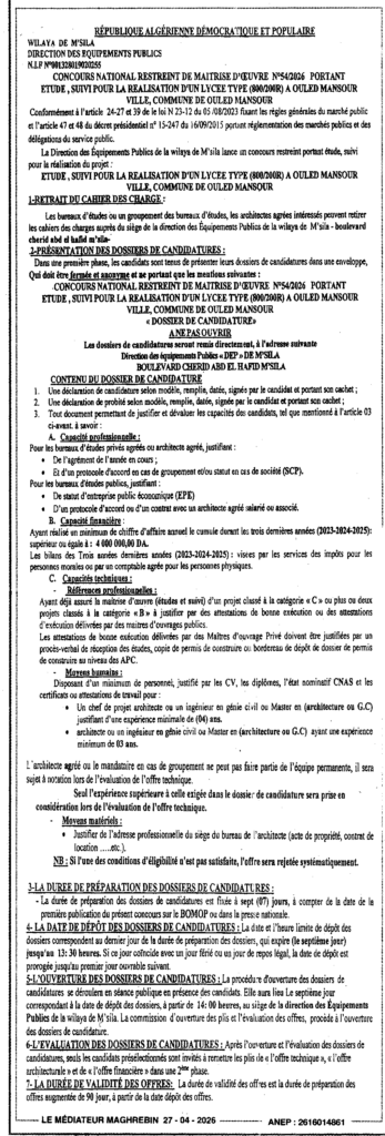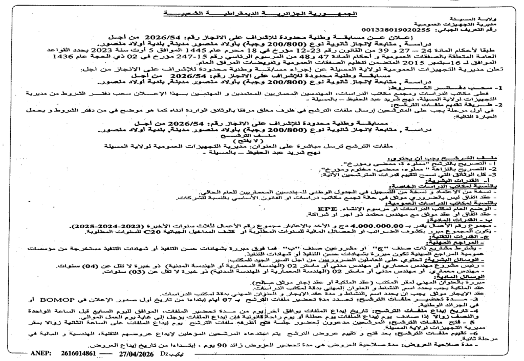 إعلان عن مسابقة وطنية محدودة للاشراف على الانجاز 2026/54 دراسة متابعة لانجاز ثانوية نوع 200/800 وجبة بأولاد منصور/ مديرية التجهيزات العمومية لولاية المسيلة