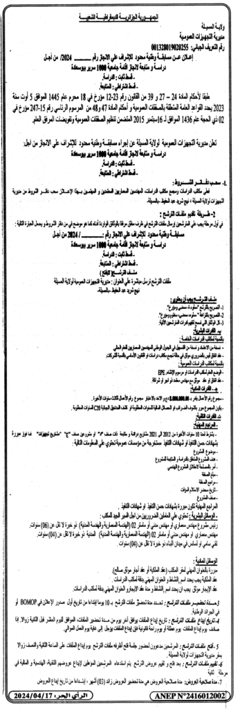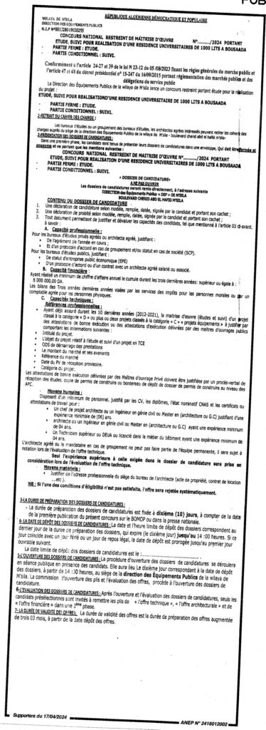 إعلان عن مسابقة وطنية محدودة من أجل دراسة ومتابعة لانجاز إقامة جامعية 1000 سرير بوسعادة/ مديرية التجهيزات العمومية لولاية المسيلة