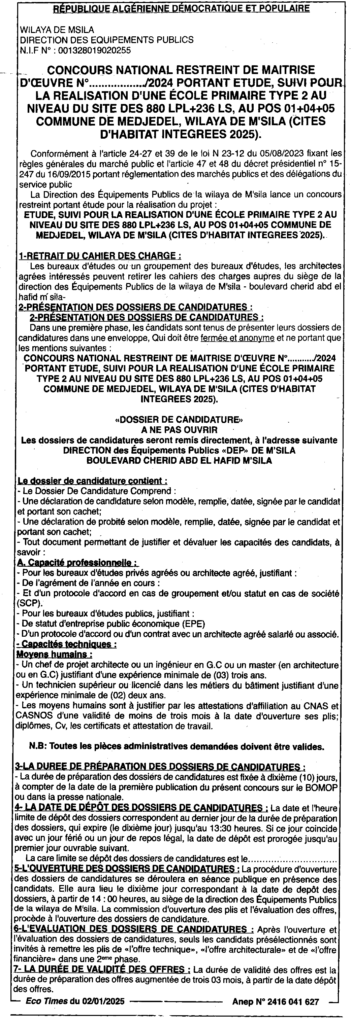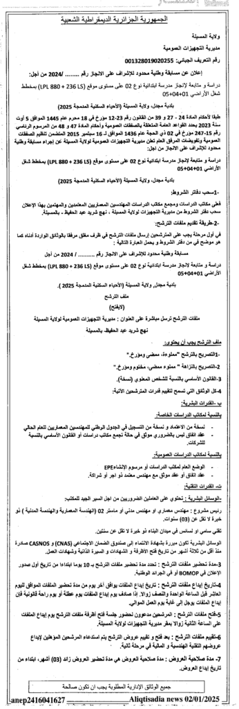 إعلان عن مسابقة وطنية محدودة من أجل دراسة ومتابعة لانجاز مدرسة ابتدائية نوع 02 على مستوى موقع (LPL 880 + 236 LS) بمخطط شغل الأراضي 01+04+05 بلدية مجدل/ مديرية التجهيزات العمومية لولاية المسيلة