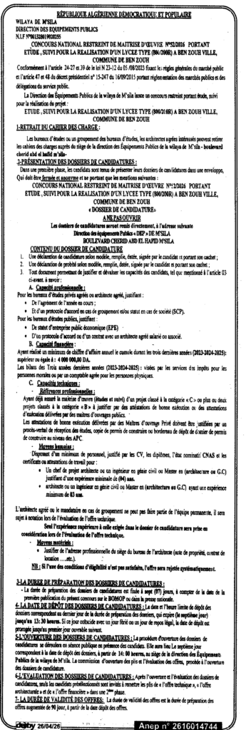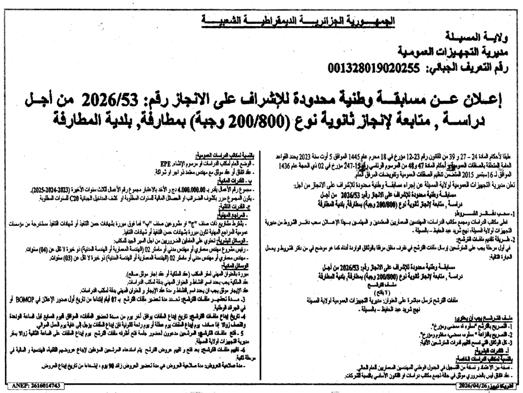 إعلان عن مسابقة وطنية محدودة 2026/53 دراسة ومتابعة لانجاز ثانوية نوع 200/800 وجبة بلدية المطارفة/ مديرية التجهيزات العمومية لولاية المسيلة