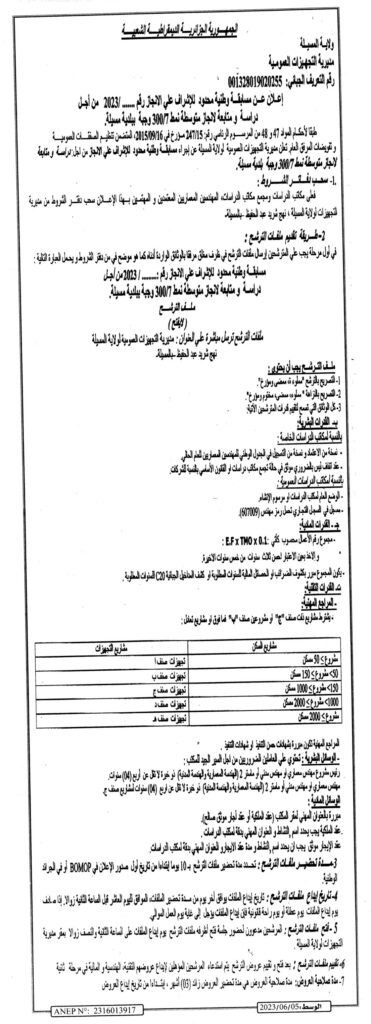 إعلان عن مسابقة وطنية محدود للإشرافة على الانجاز من أجل دراسة ومتابعة لانجاز متوسطة نمط 300/7 وجبة ببلدية المسيلة/ مديرية التجهيزات العمومية لولاية المسيلة