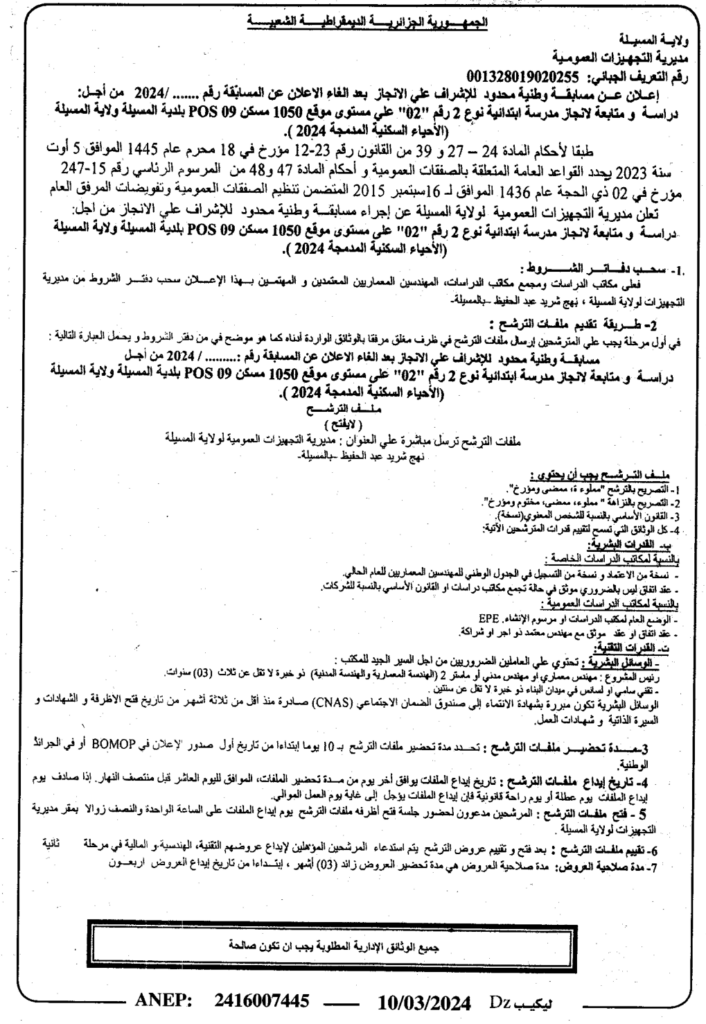 إعلان عن مسابقة وطنية محدود للاشراف على الانجاز بعد إلغاء الاعلان عن المسابقة من أجل دراسة ومتابعة لانجاز مدرسة ابتدائية نوع 2 على مستوى موقع 1050 مسكن 09 POS ببلدية المسيلة/ مديرية التجهيزات العمومية لولاية المسيلة