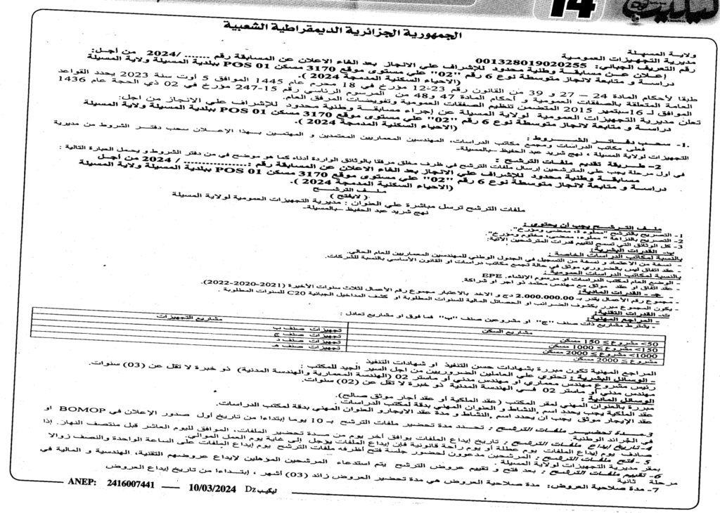 إعلان عن مسابقة وطنية محدود للاشراف على الانجاز بعد إلغاء الاعلان عن المسابقة من أجل دراسة ومتابعة لانجاز متوسطة نوع 6 رقم 02 على مستوى موقع 3170 مسكن 01 POS ببلدية المسيلة/ مديرية التجهيزات العمومية لولاية المسيلة