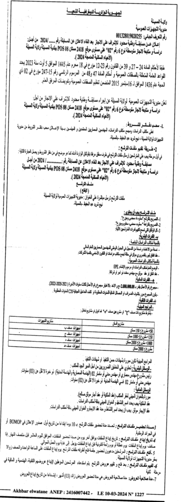 إعلان عن مسابقة وطنية محدود للاشراف على الانجاز بعد إلغاء الاعلان عن المسابقة من أجل دراسة ومتابعة لانجاز متوسطة نوع 6 رقم 02 على مستوى موقع 2418 مسكن 08 POS ببلدية المسيلة/ مديرية التجهيزات العمومية لولاية المسيلة