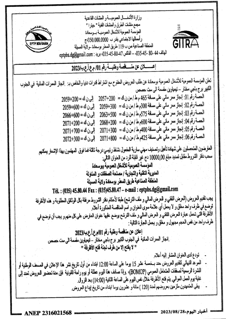 إعلان عن مناقصة وطنية رقم 01/ م.ع.أ.ع.ب/2023 المؤسسة العمومية للأشعال العمومية ببوسعادة