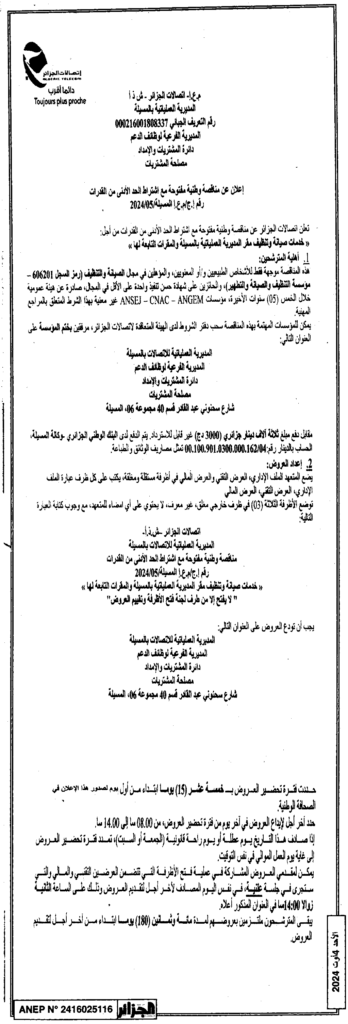 إعلان عن مناقصة وطنية مفتوحة رقم إ.ج/م.ع.إ المسيلة/05/2024 اتصالات الجزائر مديرية العملياتية بالمسيلة