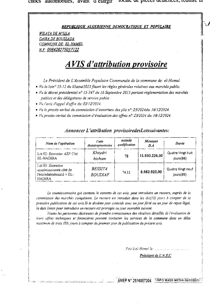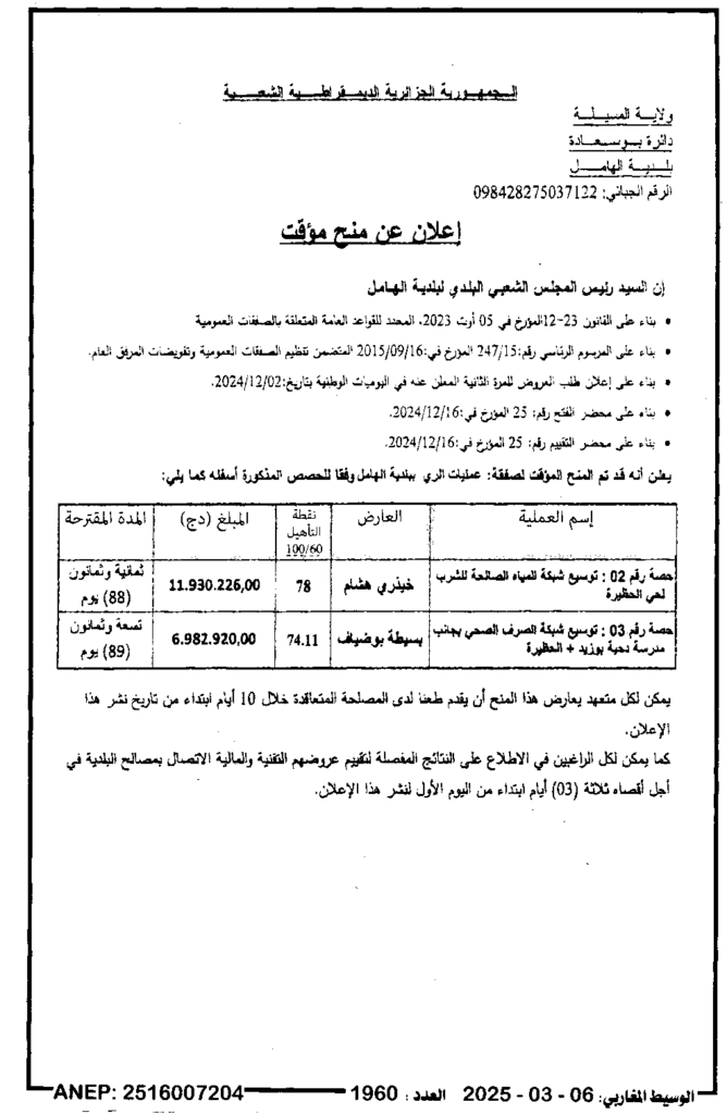 إعلان عن منج مؤقت عمليات الري/ بلدية الهامل