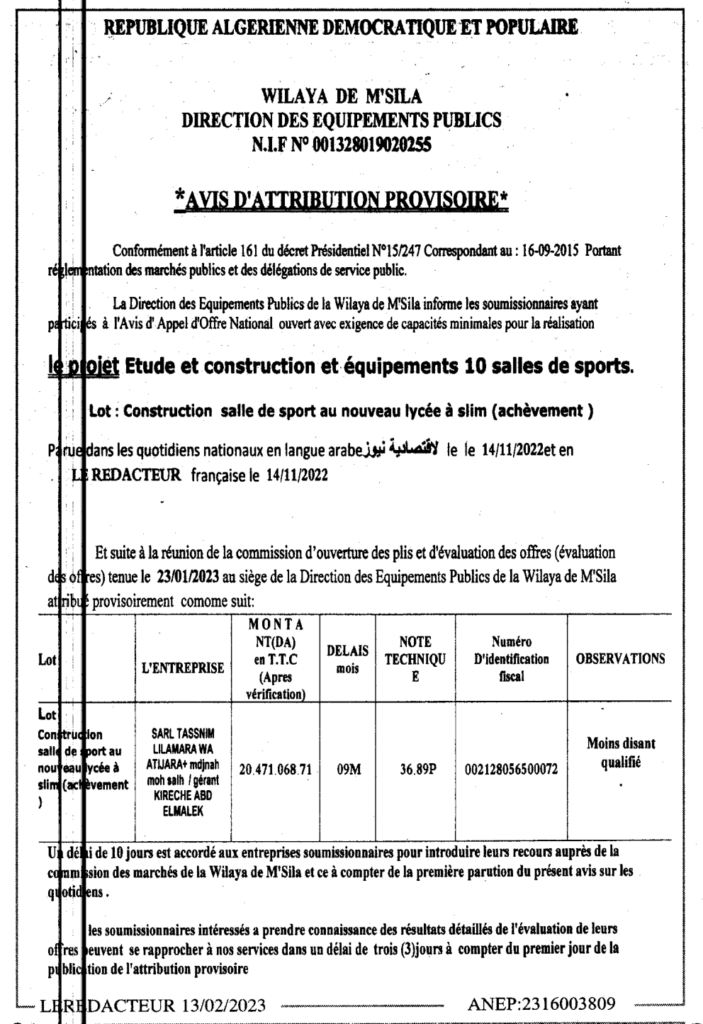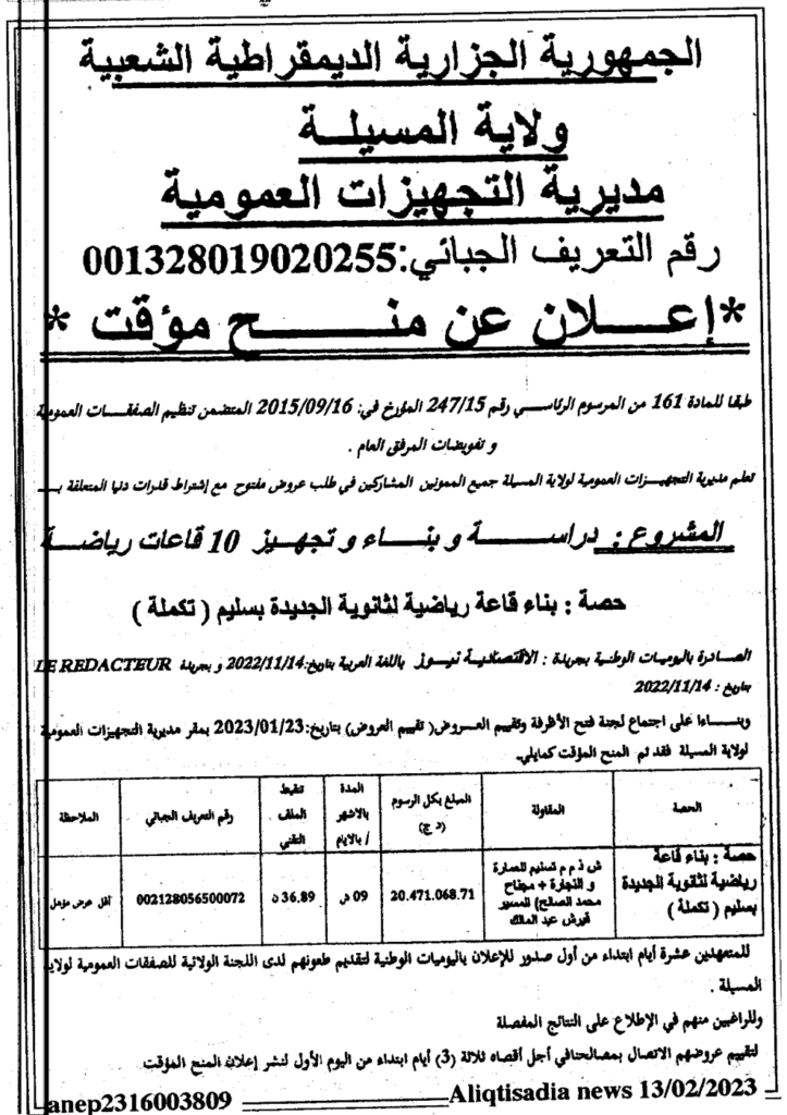 طلب عروض مفتوح مع اشتراط قدرات دنيا المتعلقة بـ : المشروع دراسة وبناء وتجهيز 10 قاعات رياضة13 فبراير، 20230 44 شاركها فيسبوك X مشاركة عبر البريد طباعة
