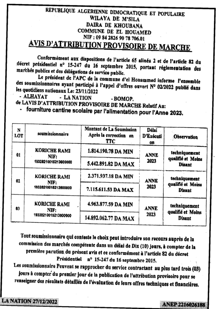 إعلان عن منح المؤقت بلدية الحوامد