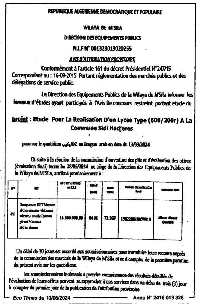 إعلان عن منح المؤقت دراسة وانجاز ثانوية نوع 200/600 وجبة ببلدية سيدي هجرس/ مديرية التجهيزات العمومية لولاية المسيلة