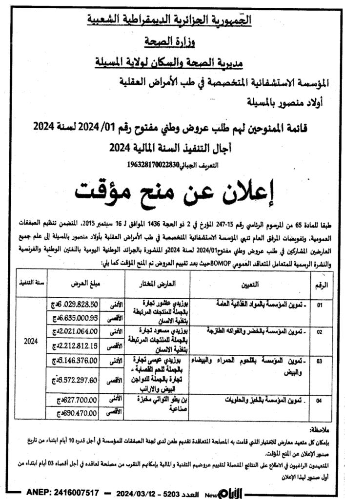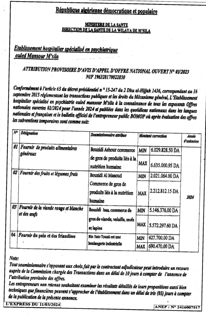 إعلان عن منح المؤقت لطلب عروض وطني مفتوح 2023/01 المؤسسة الاستشفائية للصحة النفسية أولاد منصور المسيلة