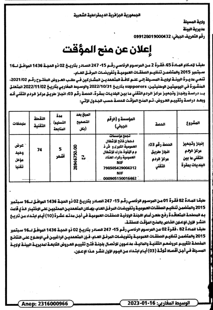 إعلان عن منح المؤقت/ مديرية البيئة لولاية المسيلة