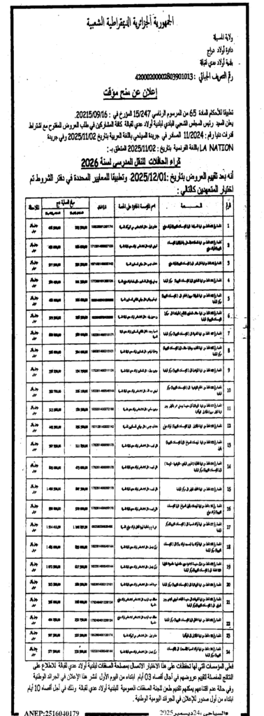 إعلان عن منح مؤقت كراء الحافلات للنقل المدرسي 2026/ بلدية أولاد عدي لقبالة