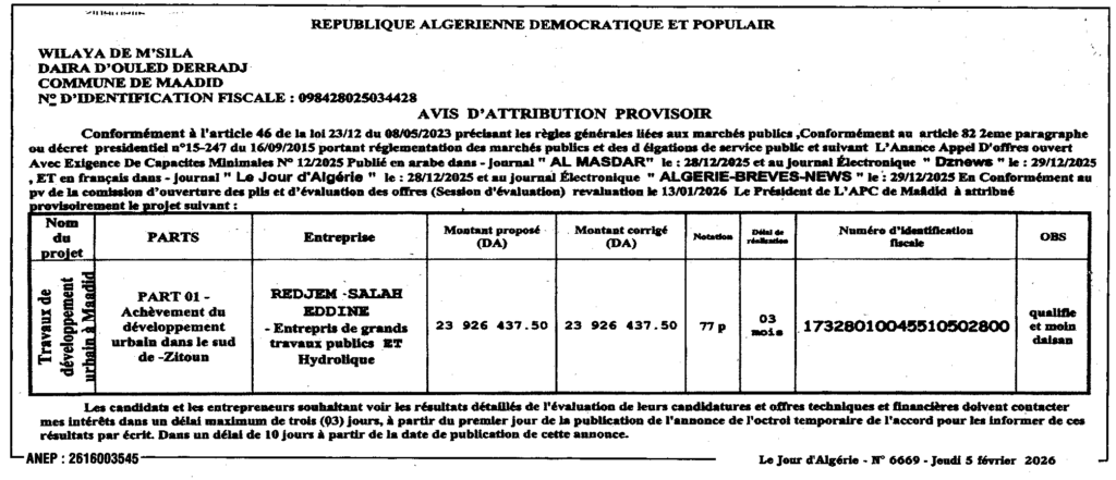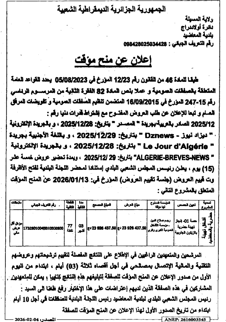 إعلان عن منح مؤقت أشغال التهيئة الحضرية/ بلدية المعاضيد