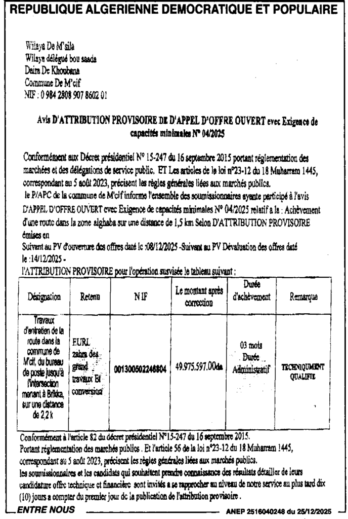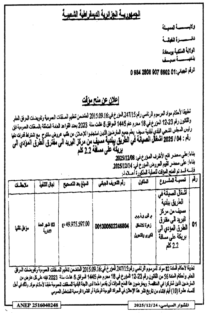إعلان عن منح مؤقت أشغال الصيانة في الطريق/ بلدية مسيف