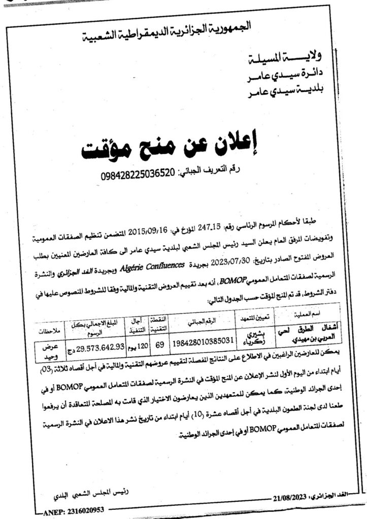 إعلان عن منح مؤقت: أشغال الطرق لحي العربي بن مهيدي/ بلدية سيدي عامر