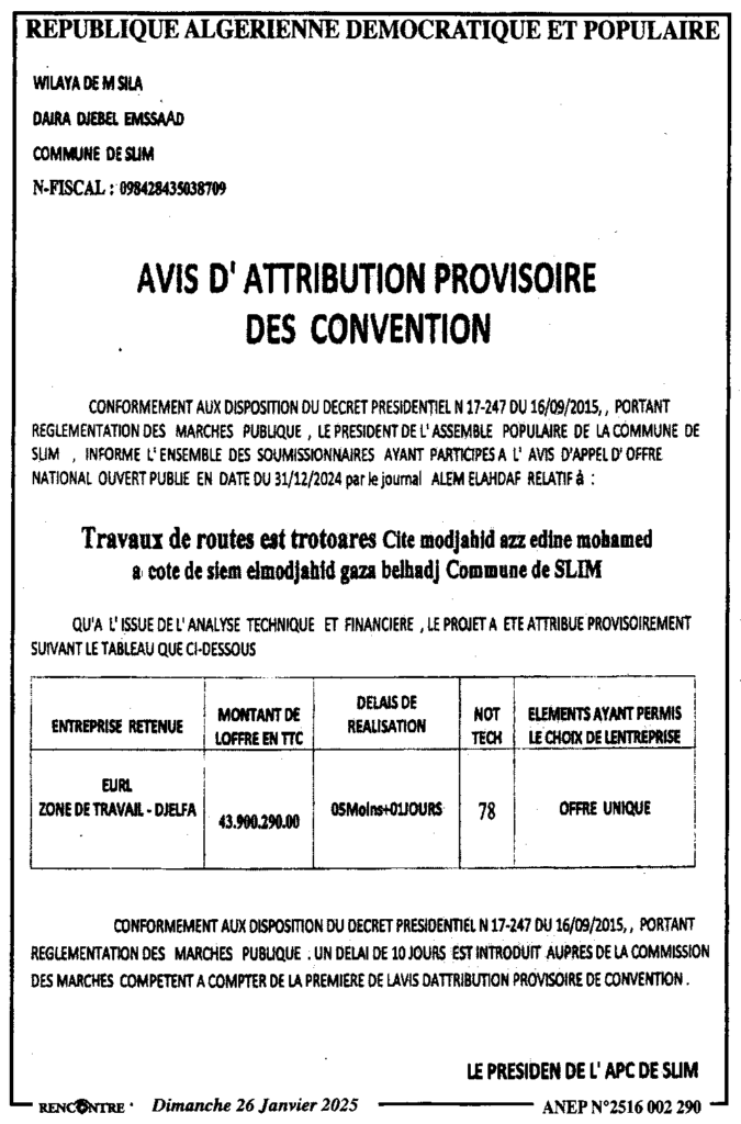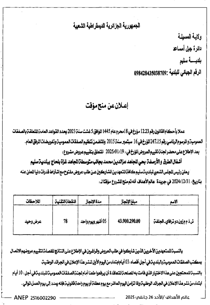 إعلان عن منح مؤقت أشغال الطرق والأرصفة/ بلدية سليم