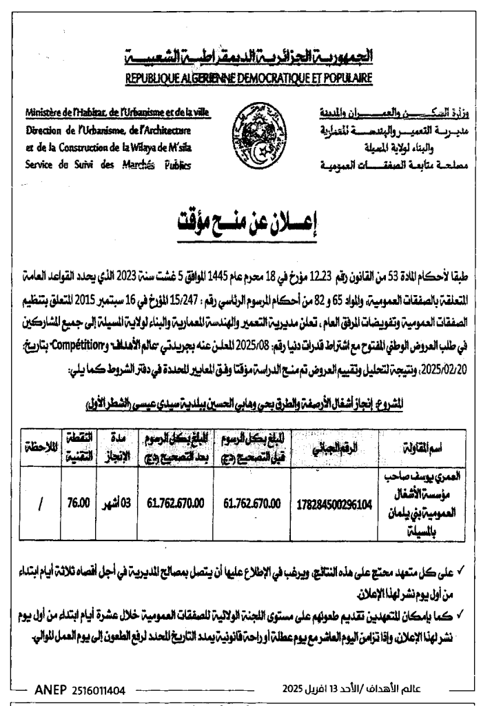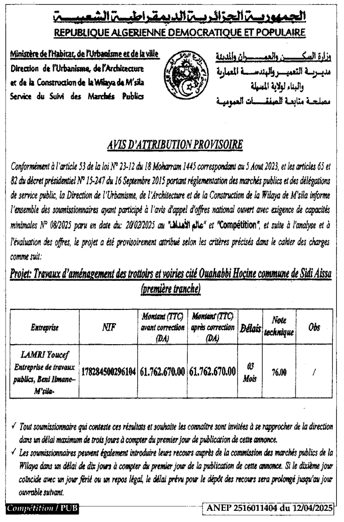 إعلان عن منح مؤقت أشغال تهيئة الأرصفة والطرق بسيدي عيسى/ مديرية التعمير والهندسة المعمارية والبناء لولاية المسيلة