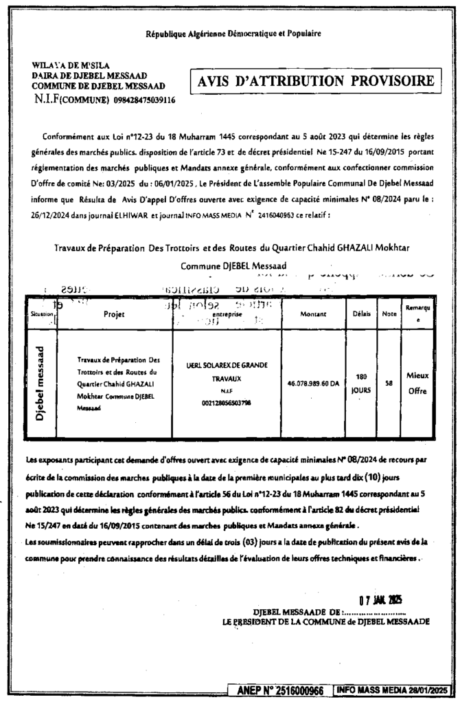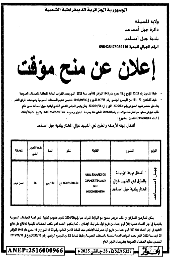 إعلان عن منح مؤقت أشغال تهيئة الأرصف والطرق/ بلدية جبل امساعد