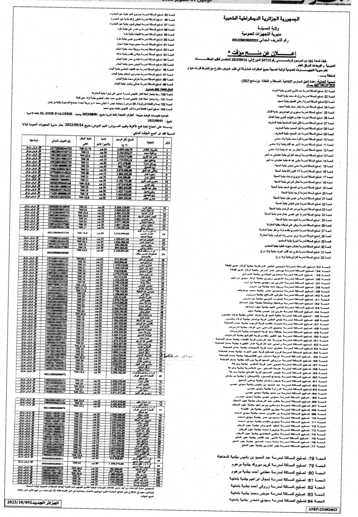 إعلان عن منح مؤقت: إعادة تأهيل المدارس الابتدائية -المساكة والتدفئة- برنامج 2023 مديرية التجهيزات العمومية لولاية المسيلة