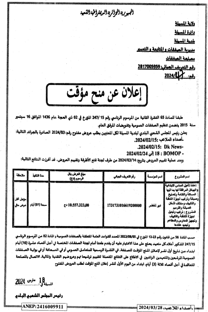 إعلان عن منح مؤقت: إعادة تأهيل المدارس الابتدائية والهياكل المرافقة لها/ بلدية المسيلة
