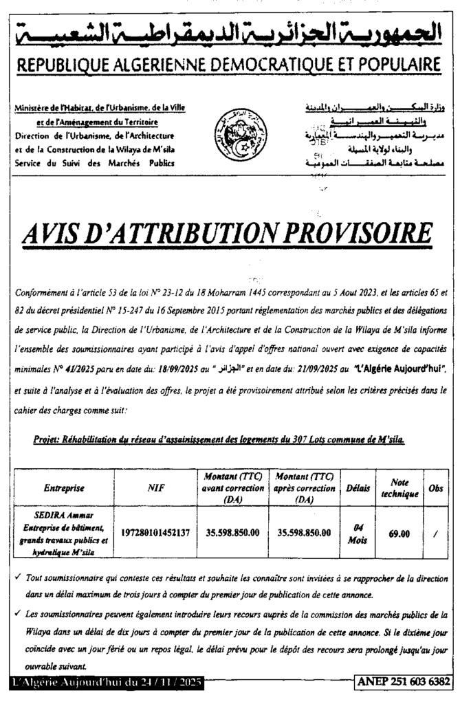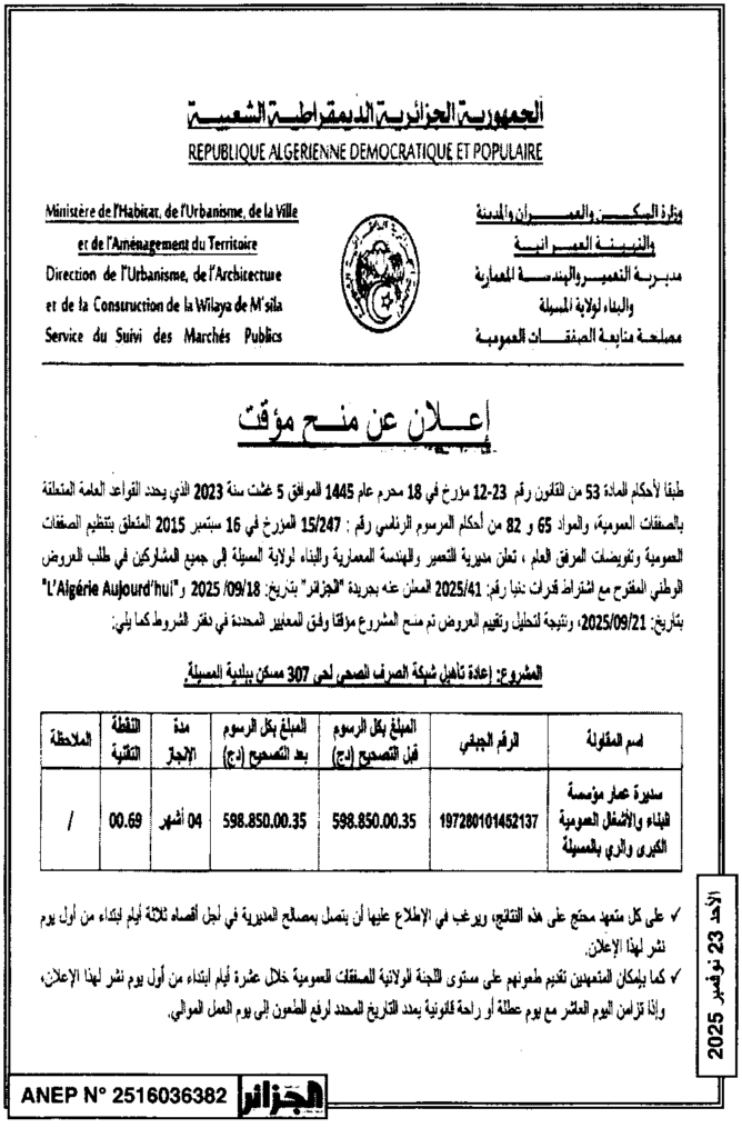 إعلان عن منح مؤقت إعادة تأهيل شبكة الصرف الصحي لحي 307 مسكن ببلدية المسيلة/ مديرية التعمير والهندسة المعمارية والبناء لولاية المسيلة