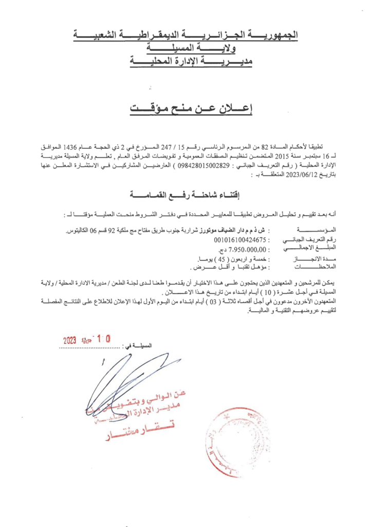 إعلان عن منح مؤقت: إقتناء شاحنة رفع القمامة/ مديرية الادارة المحلية