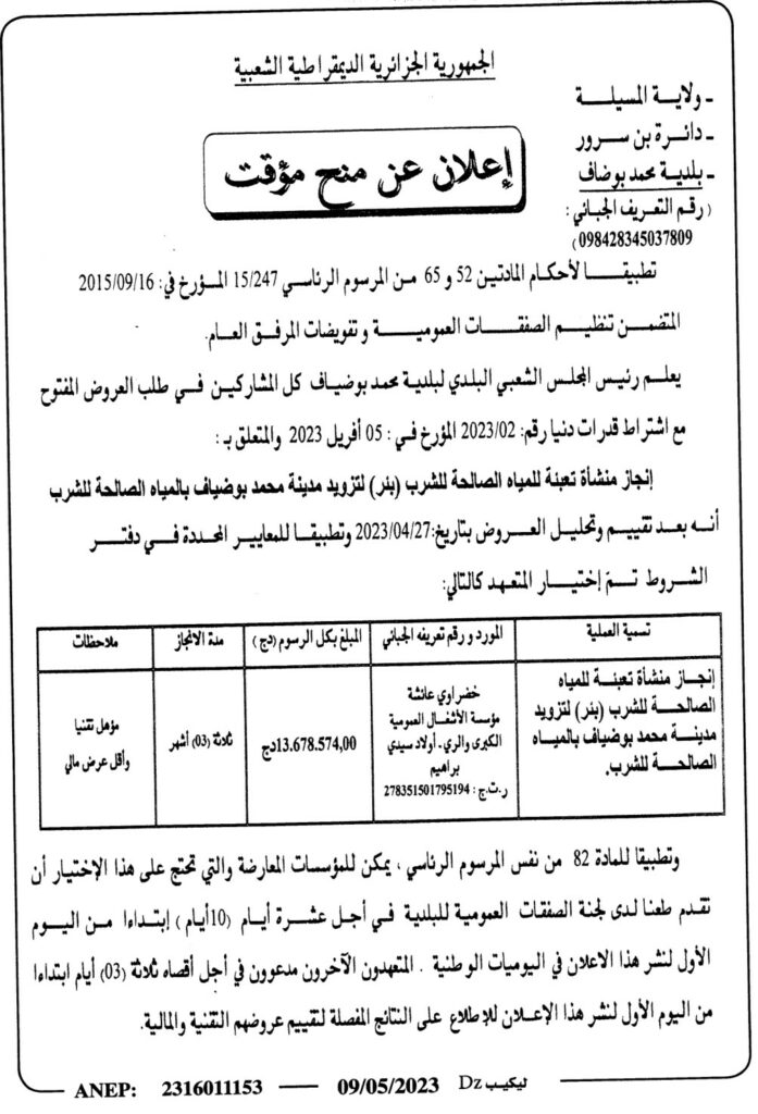 إعلان عن منح مؤقت: إنجاز منشأة تعبئة للمياه الصالحة للشرب (بئر) لتزويد مدينة محمد بوضياف
