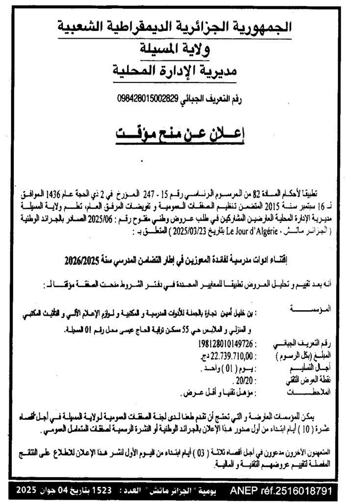 إعلان عن منح مؤقت اقتناء أدوات مدرسية لفائدة المعوزين في إطار التضامن المدرسي سنة 2026/2025 مديرية الإدارة المحلية لولاية المسيلة