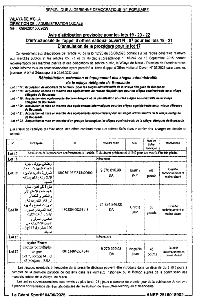 إشعارات بالمنحالصفقات العمومية