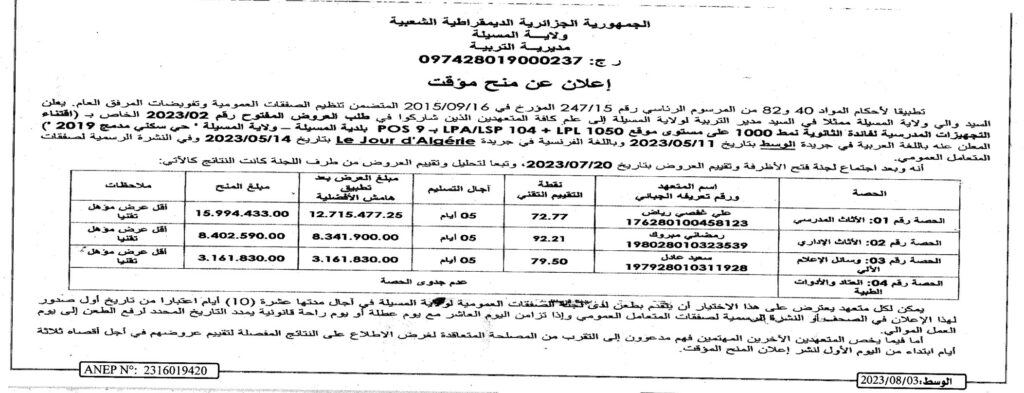 إعلان عن منح مؤقت: اقتناء التجهيزات المدرسية لفائدة الثانوية نمط 1000 ببلدية المسيلة/ مديرية التربية لولاية المسيلة