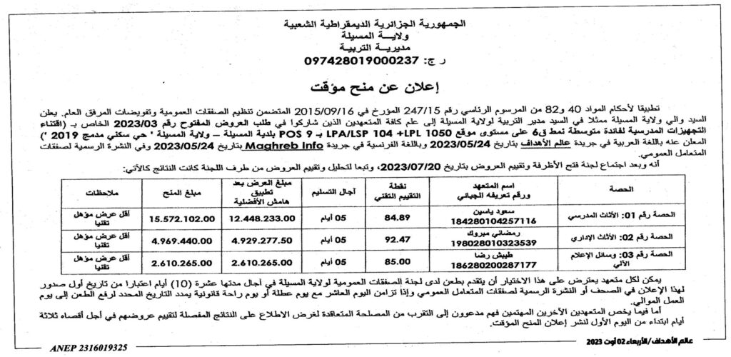 إعلان عن منح مؤقت: اقتناء التجهيزات المدرسية لفائدة متوسطة نمط ق 6 على مستوى بلدية المسيلة/ مديرية التربية لولاية المسيلة